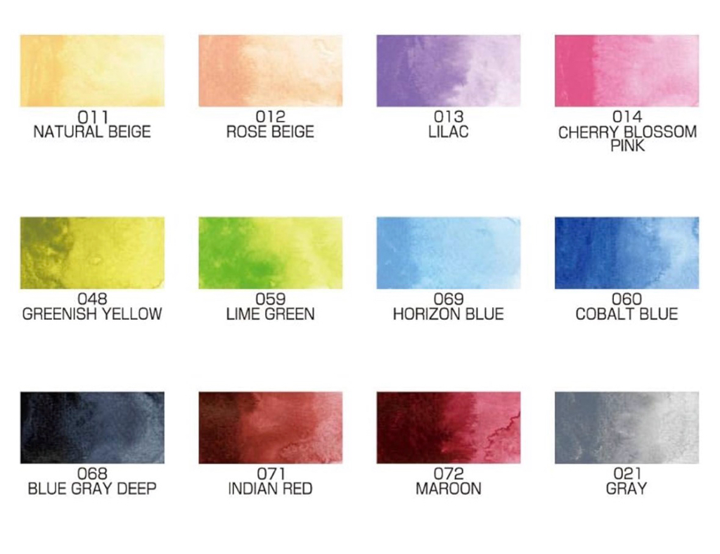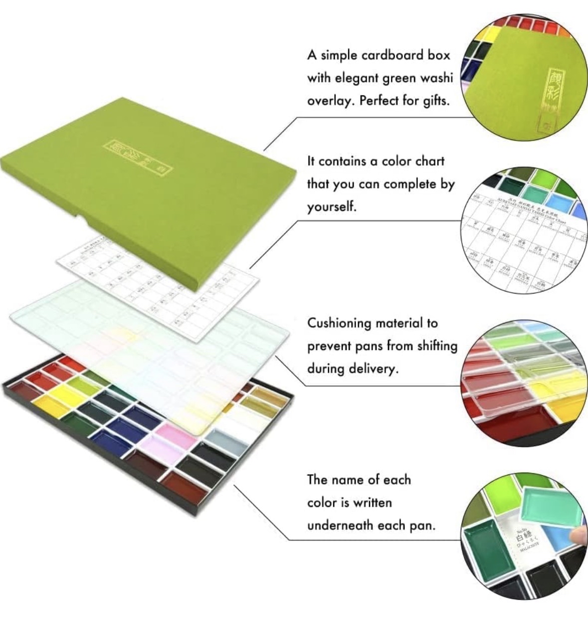 Colors] 12/24/36 New Kuretake Gansai Tambi colors, light and neutral shades for the expression of softer colors. Beige color tones, previously missing from the Gansai Tambi Color lineup, have been created and included in this new set, making it easier to paint figure illustrations. High-quality, professional-grade watercolors can be used by people of all abilities, beginners and professional artists alike. Since light and medium color tones are included, the range of artistic expression broadens when combined with other Gansai Tambi Watercolor sets. [Ink] Unique technology allows for the development of pigment ink that leaves flat-washes easily, while remaining easy to blend. Gansai Tambi ink can be diluted to create a more watercolor-like picture, while still remaining bright and opaque, or can be used as a gauche by limiting water dilution. Ink dries with a slight sheen. [Brush Dexterity] Gansai Tambi Pans are much larger than typical watercolor pans, giving you the ability to use both small or large brushes quite easily. [Color Chart] Fill-in color chart provided on the inner side of the box. Swatch your own colors easily for quick color identification [Ideal Gift Set] Packaged in a simple cardboard box with elegant green washi overlay. Perfect for gifts